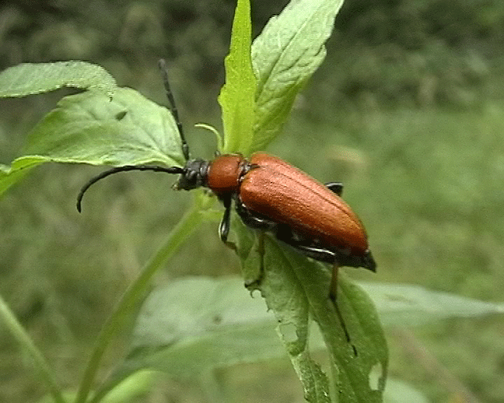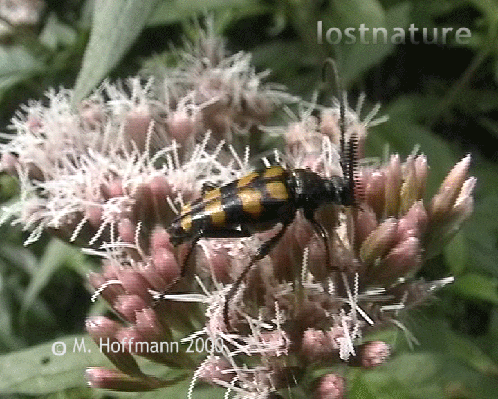 Roter Schmalbock Leptura rubra, Weibchen, UF Lepturinae, bei Söllichau, Dübener Heide, Sachsen, 2001 Vierbindiger Schmalbock Strangalia quadrifasciata, UF Lepturinae, bei Söllichau, Dübener Heide, Sachsen, 2001