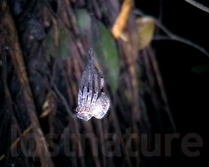 Häutung einer Laufspinne nachts an einem Faden hängend, Familie Phyllodromidae, Nähe Suckau, Kinabatangan-River, Sabah, Borneo, Malaysia, 2004