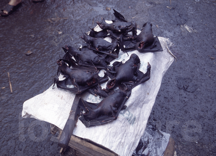 Flughunde als Delikatesse auf einem Markt in Tomohon, Nordsulawesi, Indonesien, 2001 Erbeutete Flughunde bei Bereme, New Britain, Papua-Neuguinea, 2003